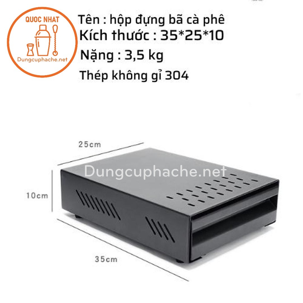 - Kích thước : 34,8 x 25 x 8,3 cm - Công dụng: Hộp đựng bã cà phê được sử dụng để đập bỏ bã cà phê khỏi tay cầm