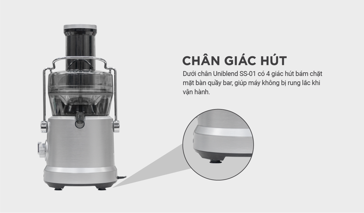 Dưới chân Máy ép trái cây Uniblend SS-01 có 4 giác hút bám chặt mặt bàn quầy bar. 4 giác hút này giúp máy không bị rung lắc khi vận hành mà sẽ chạy êm trên mặt phẳng. Chi tiết này cũng giúp tránh các trường hợp động cơ quá mạnh, máy rung lắc rơi xuống mặt đất làm giảm độ bền của máy.