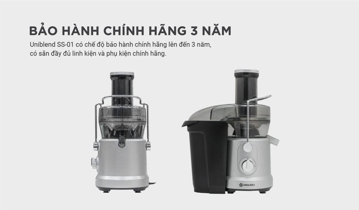 Uniblend SS-01 có chế độ bảo hành chính hãng lên đến 3 năm, có sẵn đầy đủ linh kiện và phụ kiện chính hãng nên các bạn hoàn toàn có thể yên tâm sử dụng trong thời gian dài.